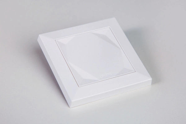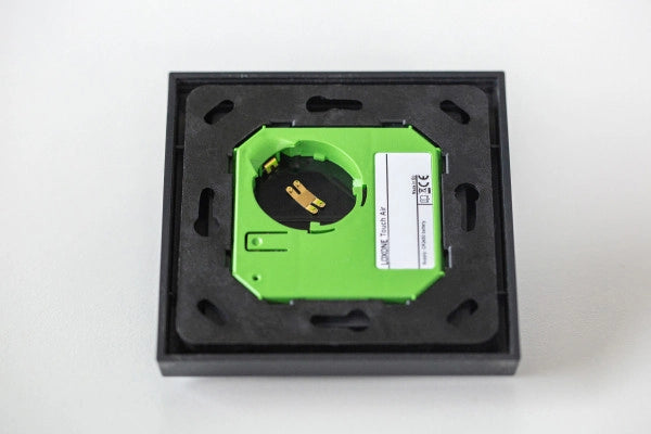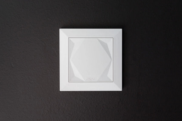 Der Loxone Touch Air verfügt über fünf Tastpunkte zur Bedienung der wichtigsten Funktionen eines Raumes. Bei Berührung einer Taste erfolgt ein Klicken als akustische Bestätigung. Zur Messung von Temperatur und relativer Luftfeuchte ist ein Sensor integriert.