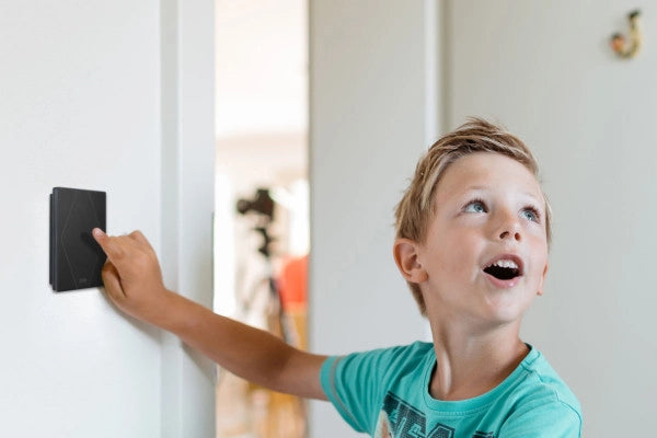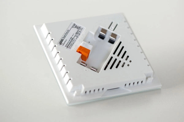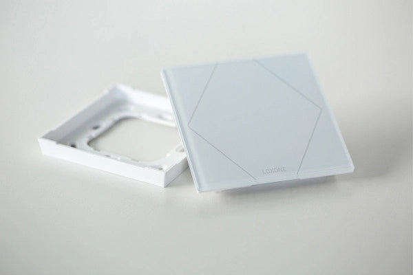 Der Loxone Touch Pure Air verfügt über fünf Tastpunkte auf einer Glasfront, zur Bedienung der wichtigsten Funktionen eines Raumes. Bei Berührung einer Taste erfolgt ein Klicken als akustische Bestätigung.